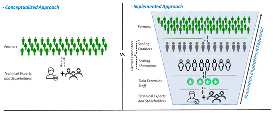 In the agriculture innovation space, the potential for the uptake of promising innovations can be limited by recurring disconnections between conceptualized solutions and the reality of end-users (mainly farmers) who are expected to adopt specific innovations [5,6,42]. This disconnect often occurs due to various factors, including differing understandings of the problem space, non-aligned perspectives in the solution space, and end-users’ lack of competency to test or use multi-functional digital tools. Therefore, we considered that the targeting and engagement of champion tool users as intermediate bridges (for testing at the village level) can significantly enhance the reach of peer farmers and subsequent uptake of BXW solutions.