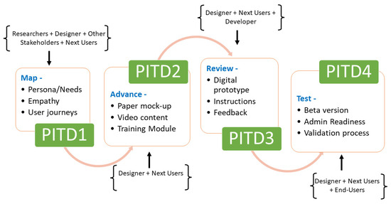 The digital innovation for BXW disease control was implemented in two phases. During the first three years (phase 1), the focus was on the development and testing of a single digital solution, but the focus shifted to diversifying from the single solution to scaling as a multi-modal solution during the latter three-year period (phase 2). In phase 1, we adopted and implemented a stepwise co-creation process, called a participatory technology design approach (participatory iterative technology design, PITD), and progressively gathered user inputs, which strengthened user engagement and improved the experience. The PITD co-creation methodology was grounded in human-centered design (HCD) and design thinking theories, guided by the notion that such an approach can increase the likelihood for adoption and sustainable outcomes and impact [26,27,28,29], while fostering social inclusion [15]. Theoretically, PITD leverages the various existing models for HCD, encompassing design orientation, research orientation, and bi-directional inclination between users and researchers and/or designers [26]. Our implementation process included cohesive engagement between stakeholders, mainly anticipated users, researchers, value chain actors, technology developers, a government agency, and non-governmental organizations, prior to the full deployment of the digital tool. As shown in Figure 3, the PITD flow involved four progressive stages, which included quarterly contact sessions, data gathering, and reviews, over a 12-month period (August 2018–August 2019). During the early stages of the process, we conducted immersive co-creation workshops with selected representative end-users to map persona, define user journeys (including fail and pain points), create mock-ups and prototypes, review and iterate minimal viable product versions of the digital tool, and pre-test the beta version. In the last stage of the PITD, we conducted field testing of the co-developed digital innovation, and this supported the transition from phase 1 to phase 2 of the project, driven by the positive user experience and diverse feedback from the on-farm interaction of farmers with the core tool (i.e., a mobile-based app, v2.0.101). The transition focused on scaling the core co-developed tool, enabled by training and facilitating farmer promoters, with desk-based support through phone calls and dedicated WhatsApp groups for the timely resolving of technical issues. Performance benchmarks were preset for field activities of the next users, primarily based on an agreed target for the farmers (end-users) to reach in their respective villages within an 8-month period. Progress towards the target was assessed through a self-reporting activity logbook and follow-up (phone-based) surveys to tally the number of farmers reached by each next user.