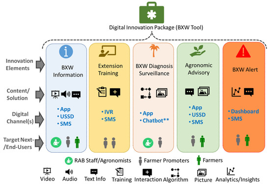 General schema of BXW digital innovation package, and the comprising innovation elements, as deployed through channels during the scaling phase of the ICT4BXW project in Rwanda.
