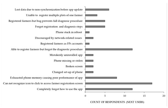Issues reported by users of smartphone-based BXW app for control of banana Xanthomonas wilt (BXW) disease in Rwanda. The respondents are farmer promoters who are considered as next users (and scaling champions) of the tool at the village level.