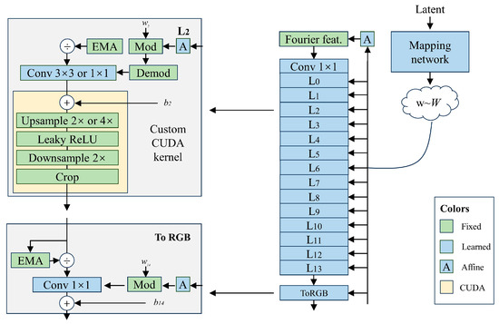StyleGAN3 achieves rotational invariance through two key modifications. First, all 3 × 3 convolution layers across the network are replaced with 1 × 1 convolutions, ensuring that only downsampling and upsampling operations propagate information between pixels thus preventing unnecessary information leakage into the hierarchical synthesis process. Second, the sinc downsampling filters are replaced with radial symmetric jinc filters, except for two critical layers. These changes significantly improve rotational invariance without compromising FID. Additionally, during the early stages of training, a Gaussian filter is applied to all images seen by the discriminator to prevent early stage training collapse. The generator may occasionally introduce high-frequency signals with small delays, degrading the discriminator’s performance. A schematic of the generator is shown in Figure 2.