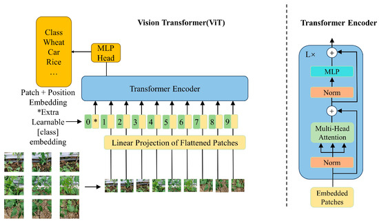 In this work, we employ the Vision Transformer (ViT) model to recognize the growth stages of tomatoes through transfer learning. The ViT architecture introduces the concept of image patches. Initially, the image is divided into non-overlapping patches of equal size, which are then encoded into sequence data using a positional encoding function. These sequence data are subsequently fed into a Transformer encoder. The output from the Transformer is processed through a fully connected layer followed by a softmax layer to produce the final classification result. The complete framework of the Vision Transformer is presented in Figure 3.