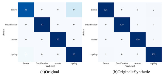 Figure 5 presents the confusion matrix results for the classification task, which was performed using both original and StyleGAN-generated images. The matrix indicates that classification performance—particularly in distinguishing true positives from false positives between the flowering and sapling stages—was notably reduced when only the original images were used. In contrast, a significant improvement in the model’s ability to accurately classify these stages was observed with the inclusion of StyleGAN-generated images, resulting in a marked enhancement in overall classification performance. Specifically, the confusion matrix for the combined dataset, comprising both original and generated images, demonstrates a substantial increase in overall accuracy, as well as a more balanced distribution between true positives and false positives. These results emphasize the considerable advantages of augmenting the dataset with generated images, highlighting their critical role in enhancing the robustness and effectiveness of the classification model.