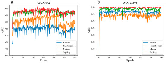 Figure 6 illustrates the AUC curves during training for ViT-Base, comparing the original dataset (Figure 6a) with the dataset augmented by generated images (Figure 6b). AUC, which assesses the model’s performance at various classification thresholds, provides a more comprehensive evaluation by minimizing the effect of a single threshold. The results show that adding generated images significantly improves the performance of ViT-Base in the four-class classification task, with fewer fluctuations compared to using only the original dataset, and the VIT model can better perform its performance. This suggests that images generated by StyleGAN3 can effectively enhance the model’s classification accuracy.