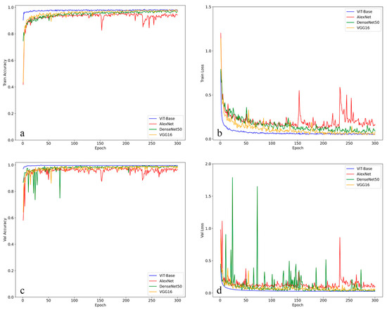 In this subsection, we first perform a detailed curve analysis of four models, examining their training and validation performance regarding accuracy and loss. Specifically, we investigate the ViT-Base model, augmented with generated images, and compare its four-class classification performance against that of three widely used models—AlexNet, DenseNet50 [31], and VGG16—enhanced with generated images. As presented in Figure 7, the curve analysis reveals that the ViT-Base model achieves the most consistent and favorable performance. It demonstrates smooth convergence, the fastest reduction in loss, and an impressive validation accuracy of 99.6%. In contrast, the other models show varying levels of instability, with AlexNet exhibiting notable overfitting issues. These findings suggest that the ViT-Base model not only outperforms the others in terms of accuracy but also maintains greater stability throughout the training process.