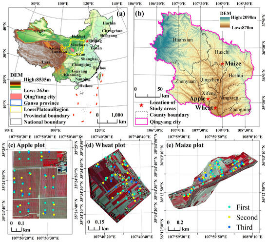 The location and UAV-based false color image collected on 2 May 2022, of the three farmland plots used in this study. (a) Location of Qingyang City in Gansu Province, Loess Plateau, and China, respectively; (b) location of the three experiment sites in Qingyang City; (c–e) UAV-based false color images and measured points distribution on the three study plots, respectively.