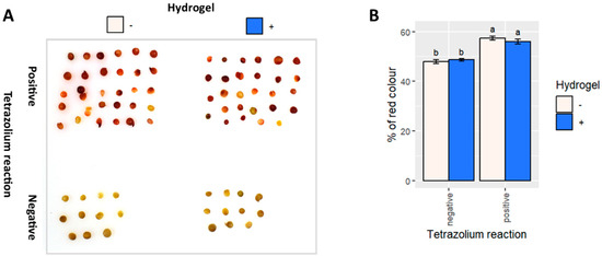 The tetrazolium (TZ) test assesses the germinability of canola under control conditions and with hydrogel treatment. The negative control consists of seeds incubated for 1 h at 95 °C. (A) Photographs of stained seeds. (B) Semi-quantitative evaluation of the TZ reaction, calculated as the percentage of red pixels. Statistical analysis was performed using one-way ANOVA followed by Tukey’s post hoc test. Different letters indicate statistically significant differences (p > 0.05).