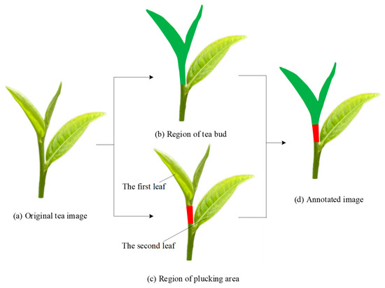 Annotation of the tea image: (a) original image; (b) region of tea bud; (c) region of plucking area; (d) annotated image.