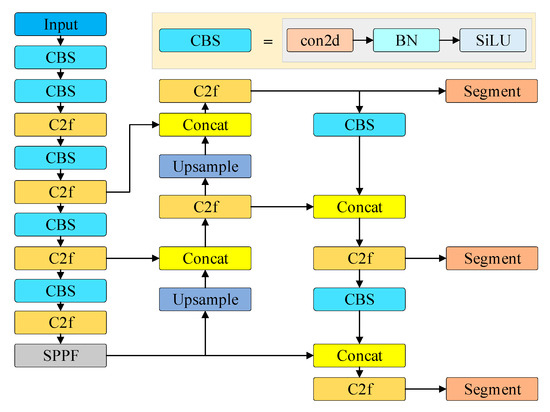 The YOLOv8-seg network structure consists of input, backbone, neck, and head modules, as illustrated in Figure 3. The backbone is composed of a CBS module, C2f module, and SPPF module. The kernel size of the first convolution layer has been modified from the original 6 × 6 to 3 × 3 based on the YOLOv5 network. Moreover, all C3 modules have been replaced with C2f modules, resulting in further enhancements in computational efficiency. The neck module is utilized for feature fusion on the feature maps generated by the backbone network. The decoupled structure is employed in the head component, where multiple parallel branches are utilized to extract category features, position features, and mask features, respectively.