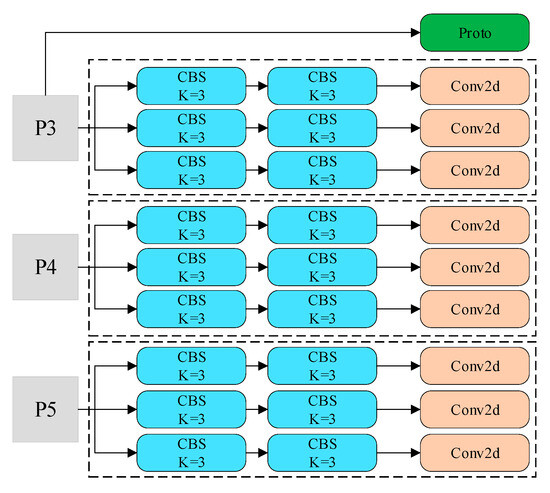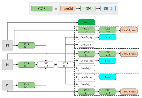 The original YOLOv8-seg head structure, as shown in Figure 5, contains a large number of parameters, resulting in high computational cost. In this study, the model was lightweight by introducing shared convolution and 1 × 1 convolution to reduce the amount of calculations. The improved YOLOv8-seg head structure is shown in Figure 6, wherein all the white modules employ shared convolutions, including the CGS modules and Conv2d modules for classification and regression. In the regression and classification branches, the output feature maps of the neck component initially undergo convolutional operations using 1 × 1 shared convolutional blocks (CGS) followed by subsequent processing through two 3 × 3 shared convolutional blocks (CGS) for classification and detection. The bounding box regression results of different scales are scaled using a scale factor after the regression calculation in order to address the issue of inconsistent target scales detected by different regression branches due to the shared convolution. The segmentation task is performed at the pixel level, with a focus on calculating more refined spatial features. In order to ensure the segmentation accuracy, this branch abstains from utilizing shared convolutions. The Group Normalization (GN) module, proposed by Wu et al., has been demonstrated to improve calculation accuracy in detection and segmentation tasks compared to Batch Normalization (BN) [34]. The utilization of shared convolution inevitably leads to a certain degree of accuracy degradation. Therefore, in this study, Group Normalization (GN) was employed as an substitute for Batch Normalization (BN) within the CBS, resulting in the formation of the CGS module to enhance the accuracy of final calculation. Moreover, the computational burden of the model can be further reduced by a 1 × 1 convolution.