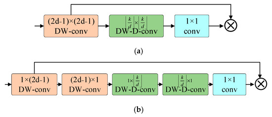 The structure of the LKA module and LSKA module: (a) LKA module; (b) LSKA module.