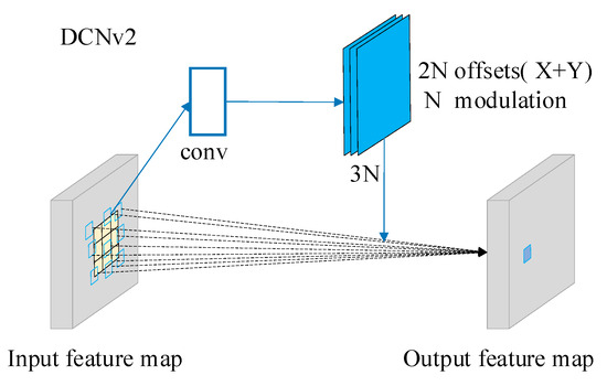 Traditional convolution performs well in handling static or regular targets; however, it may encounter challenges when dealing with irregular and variable shapes of tea buds, as well as significant differences in size. Compared to traditional convolution networks, the deformable convolution network (DCN) exhibits better recognition capabilities for diverse shapes and sizes of tea buds by dynamically adjusting the spatial and structural characteristics of the target. The deformable convolution network version 1 (DCNv1) introduces learnable offsets to accommodate the deformation of objects in the image; however, the new position of the sample point after offsetting may move beyond the ideal offset range. To address this limitation, in DCNv2, each sample not only learns the offset as in DCNv1, but also modulates it using the learned modulation parameters. To be specific, the DCNv2 introduces a modulation scalar in the convolution process, which represents the feature amplitude change at the kth position. This enables the network to prioritize critical features, reduce irrelevant information interference, and consequently enhance the model’s performance. The structure of the DCNv2 is shown in Figure 9.
