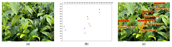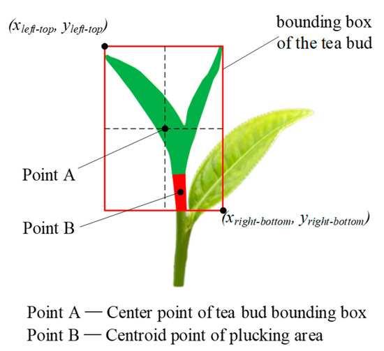 Generally speaking, the centroid of the plucking area is located in the bounding box of the tea bud because the plucking area is one part of the tea bud. Therefore, the point in range matching method (PIRM) can be used to match the plucking point with the central point of the tea bud’s bounding box. As shown in Figure 3, the width coordinate x of the plucking point was located between the left and the right of the tea bud. Similarly, the height coordinate y of the plucking point was located between the top and the bottom of the tea bud. The core idea of the PIRM is to seek which tea bud bounding box satisfies the conditions of Equations (5) and (6).