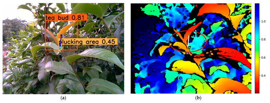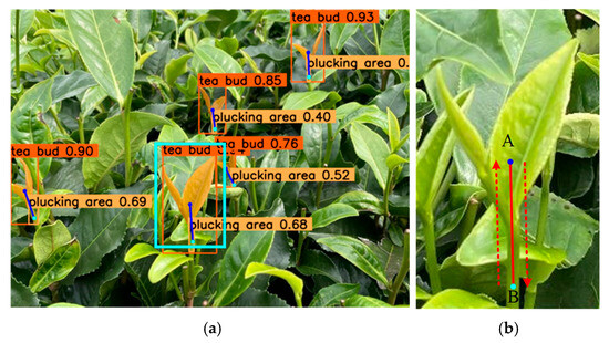 In addition, the precision, recall, and mAP results of tea bud detection and segmentation exhibited smaller variance; however, for the plucking area detection and segmentation, the results were notably different. Analyzing the reason for this, the plucking area is small, which makes it difficult to detect and segment. Meanwhile, even a small error can lead to a large scaling deviation because of its small dimension.