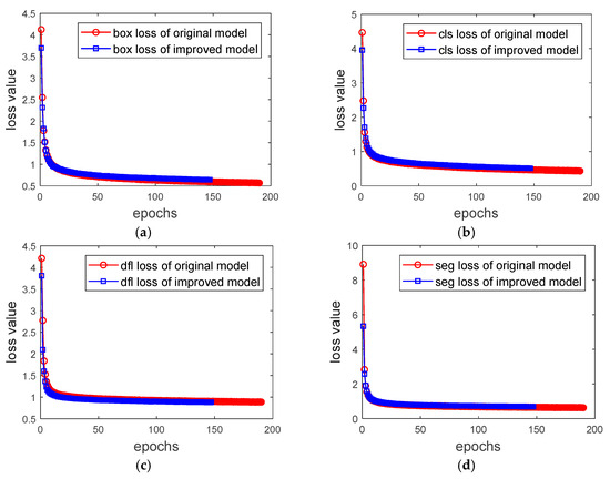 Curves of loss value changing for original and improved models: (a) box loss; (b) classification loss; (c) distribution focal loss; (d) segmentation loss.