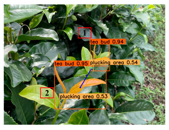 Analysis of the causes of failure in the feature point matching process was the main work in this study. In the failure cases of the PIRM, we learned that the main reason was that the centroid of the plucking area and the central point of the tea bud bounding box were located together or separately in the bounding box of another tea bud. As shown in Figure 19, the plucking point of the NO.1 tea bud was located in the bounding box of the NO.2 tea bud and was closer to the central point of the bounding box of the NO.2 tea bud. In the failure cases of the NPM, the main reason was that the plucking point of another tea was indeed closer to the central point of the bounding box of this tea than the bounding box of that tea. It can be seen in Figure 20a that the plucking point of the NO.1 tea bud was closer to the central point of the bounding box of the NO.2 tea bud than to the NO.1 tea bud.