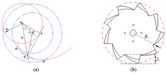 As illustrated in Figure 2a, Q1 and Q2 represent the starting and ending points of the edge line, respectively. O and O1 denote the rotational centre and the centre of the base circle. R0 is the radius of the base circle. Consider a point Q on the edge curve, where the normal to the curve intersects the base circle at point K. This intersection defines the slip angle at this point as τ. The relationship between the radius vector Rk and R0 is given by R0 = Rk cosα, where loQ = ρ, and the eccentricity distance is e. This relationship leads to the following expression for the slip angle: