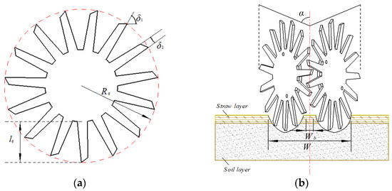 Straw is a hollow, flexible material, and its movement results in increased collisions, rebounds, and other dynamic states. To mitigate the impact of these unpredictable movements and achieve an optimal clearing zone, oppositely mounted finger-type straw clearing discs are used, which help clear backfilled and irregularly moving straw. Additionally, the tilted fingertips of the discs crush large clods of soil, reducing the resistance encountered during operation. The toggling action of the straw-clearing disc moves the straw out of the sowing area, effectively preventing straw interference and accumulation. Reducing the distance at the top of the clearing teeth minimizes the leakage clearing area (Wb), ensuring the cleanliness of the sowing belt. A schematic diagram of the clearing area is shown in Figure 3. In the Huang-Huai-Hai region, both strip sowing and wide seedling belt sowing are commonly used. Strip sowing arranges the seeds in evenly spaced rows with a row spacing of 15 cm, reserving a 30 cm corn seeding belt, while wide seedling belt sowing uses a row spacing of 20 cm without reserving a corn seeding belt. Wide seedling belt planting has been shown to improve wheat yields [37]. To achieve optimal sowing performance and reduce working resistance, the working area between the rows was designed to avoid cutting stubble. Accordingly, the maximum width of the working area was set to 20 cm, with the installation angle of the straw removal disc set at 28° and the working depth at 2 cm. The rotary radius of the straw removal disc was calculated to be 170 mm. To prevent straw from being picked up and sliding down to the roots during the dumping process, the tops of the grass-raking teeth were designed with a slanted profile to direct the straw outward, ensuring the efficiency of the sowing belt. This design helps maintain the clearing effect of the sowing belt and reduces blockage rates. Based on operational experience and comprehensive analysis, the values for δ1 and δ2 were set to 58° and 3.5°, respectively, to achieve uniform straw cleaning and an optimal working area width W: