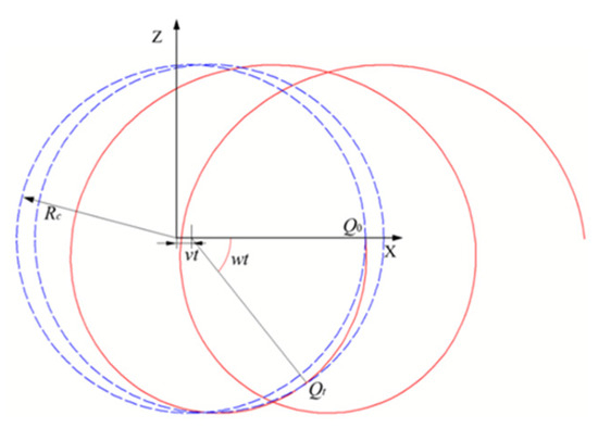 where XM and ZM are the displacement of point M along the x and z axes (m), respectively. Rc is the rotational radius of the straw-cutting disc (m), w is the rotational angular speed of the straw-cutting disc (rad/s), and t is the operation time (s). From Figure 4, it can be observed that the point Q is at Q0 when t = 0. By differentiating Equation (3), the absolute motion speed of point Q is given by Equation (4):