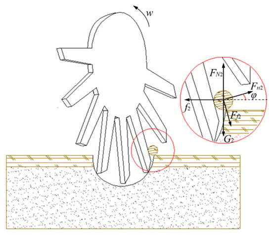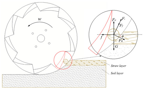 During the straw-clearing process, the teeth of the straw-clearing disc penetrate the straw layer, generating rotary motion upon contact. The linear velocity of the tooth tips matches the working speed. In the continuous movement of the straw, it is necessary to overcome ground friction and the friction between the cutter teeth and the straw, resulting in the expulsion of the straw. Figure 6 illustrates the force on the straw, and the relationship is expressed in Equation (6):