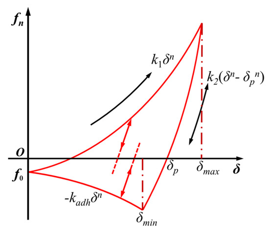 The total normal contact force fn primarily comprises the hysteretic resilience force fhys and the normal damping force fnd. The overlap relation between the normal contact force and inter-particle for this particle contact model is detailed in Equations (7)–(9):