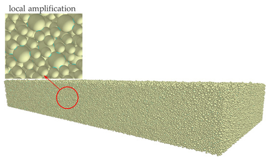 where fts(n−1) represent the tangential force at a moment (N), and Δ is the time step (s). Δfts denotes the tangential force increment (N), while γt is the tangential stiffness coefficient of the particles. δt represents the tangential overlap between particles (mm). The tangential damping primarily depends on the interparticle tangential damping coefficient βt and the interparticle tangential velocity vt, as described by the following Equation (12):
