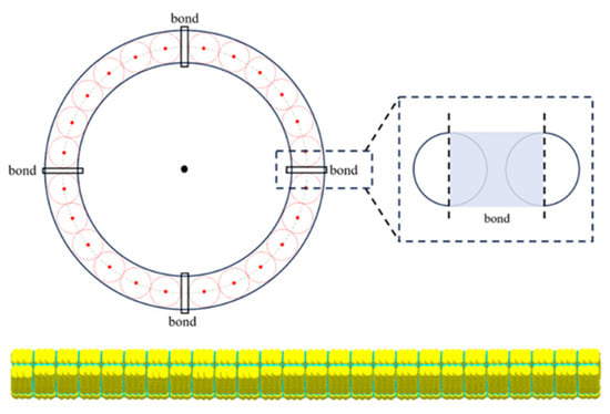 Wheat straw is randomly distributed in the field and exhibits flexibility, generating a complex movement process during equipment operation. To accurately represent the original straw, a hollow flexible straw model was developed using the Hertz–Mindlin Bonding V2 model in EDEM, where bonding was established between particles to simulate the effects of tension, compression, shear, and torsion [42,43]. Custom properties, including force (Fn,t) and moment (Mn,t), are defined as follows: