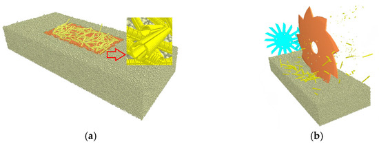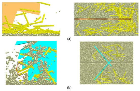 To further elucidate the interactions among the straw treatment components—straw and soil—simulations were conducted using EDEM software, as illustrated in Figure 13. As shown in Figure 13a, the straw-cutting disc effectively cuts and disperses the straw to both sides. During cutting, when straw contacts the blade, it is either cut or directly ejected by rotation, gaining speed. After leaving the blade, the straw continues its outward trajectory, forming a narrow clearing belt away from the blade position, with minimal straw remaining near the blade. In Figure 13b, the rotating straw-clearing discs direct stalks obliquely outward from both sides, further widening the cleared strip. The opposing action of the straw-clearing discs creates a clearance zone, with the narrowed strip produced by the discs enhancing the efficiency of straw removal within this area. This outcome aligns with the analysis in Section 2.3, illustrating that the discrete element method effectively supports the optimization of the device.