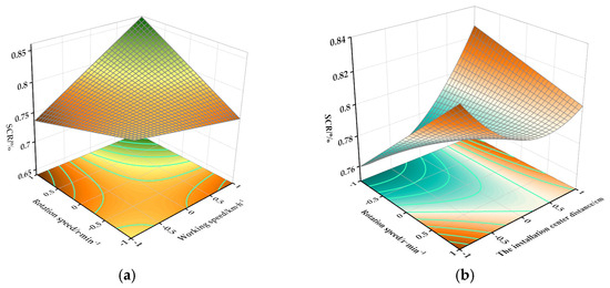 Response surface of interaction factors influencing SCR. (a) Interaction of rotation speed and working speed to SCR; (b) interaction of rotation speed and the installation centre distance to SCR.
