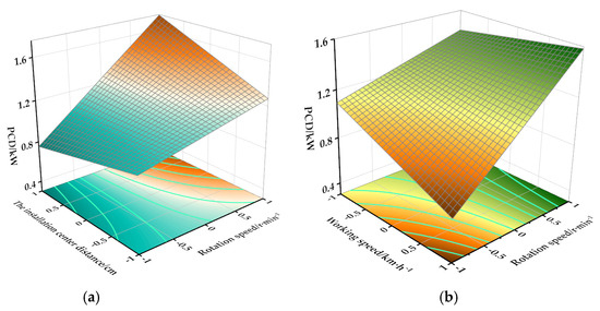 Response surface of interaction factors influencing PCD. (a) Interaction of rotation speed and the installation centre distance to PCD; (b) interaction of rotation speed and working speed to PCD.