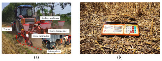 Field trials were conducted to assess straw-clearing efficiency and machine passability under optimal operating conditions, as illustrated in Figure 14a. Five tests were performed within the operational area, with each measurement zone spanning 100 cm in length and a single sowing row in width. Straw samples were collected from each zone both before and after operation, and their weights were recorded, as shown in Figure 14b. The machine passability of the implements was evaluated in accordance with Operation specification for no-tillage maize drilling machinery and Technical specification forno-tillage seeding machinery operation to determine continuous and normal equipment operation and to assess blockage levels during use. The tests consisted of three operational passes over a designated 50 m measurement area. Machine passability was considered satisfactory if no blockage or only minor blockage occurred.