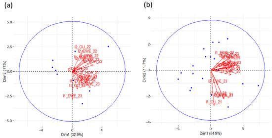 Principal component analysis (PCA) of grain yield (GY) for 2 input levels (I1 = high; I2 = low) and 9 location–year combinations for (a) 10 hybrid rye cultivars and (b) 20 wheat cultivars; blue dots are individual cultivars.