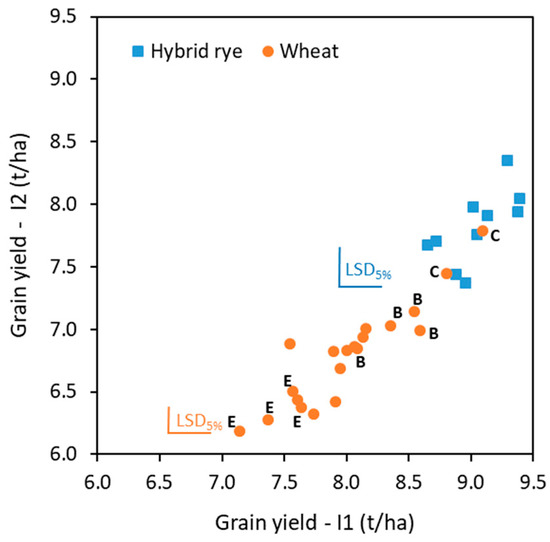 Grain yield in I1 vs. I2 for 10 cultivars of hybrid rye and 20 cultivars of wheat across 9 location × year combinations; uppercase letters indicate the grain quality of wheat: E (=excellent), B (=good), and C (=feed quality) are indicated, the remainder are in class A (=very good); LSD5% indicates the least significant difference at p < 0.05 for wheat and hybrid rye, respectively.