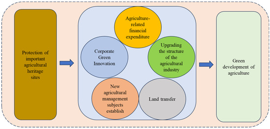 Agriculture depends on land, and land plays a crucial role in the process of greening agriculture [39]. In the process of preserving agricultural heritage sites, governments often encourage farmers to transfer land in order to avoid the abandonment of these pristine agricultural lands due to the exodus of labour. In China, it is generally the village collectives that organise and facilitate the transfer of land in the agricultural heritage site areas to large-scale agribusinesses, which then hire workers (local farmers who have mastered traditional farming techniques) to run large-scale operations. In comparison to the initial, modest agricultural production techniques observed within the designated agricultural heritage sites, the implementation of expansive and concentrated agricultural production methodologies has the potential to enhance the economic viability of agricultural production, promote environmental sustainability, optimise the allocation of resources, and advance the overall green total factor productivity in agriculture.