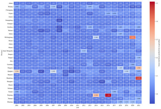 Figure 2 illustrates the specific results of green total factor productivity in agriculture for each province, as measured by the super-efficient SBM-GML index method. The number of agricultural heritage sites identified according to the selection principles is also depicted. The results show that, from the time series analysis, the green total factor productivity in agriculture shows an increasing trend but with greater volatility. With regard to the provinces, at the conclusion of the sample period, Shandong and Ningxia exhibited relatively elevated levels of green total factor productivity in agriculture.
