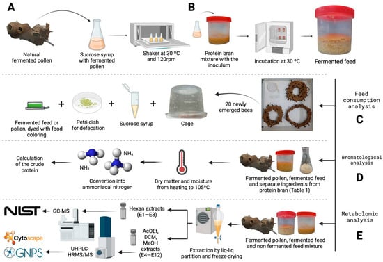 (A) Inoculum development for fermenting the protein meal, initiated from the collection of naturally fermented pollen of M. quadrifasciata; (B) prepared inoculum mixed with protein meal and incubated under controlled temperature and humidity conditions, resulting in the fermented feed used in subsequent consumption analyses; (C) pre-emergent brood disks collected from M. quadrifasciata colonies and used to set up consumption tests in controlled cages. After emergence, 20 worker bees were transferred to controlled cages where they were provided with sucrose syrup and color-coded protein feed based on their respective group (fermented feed or fermented pollen), along with a Petri dish for defecation; (D) bromatological analysis was conducted by extracting dry matter at 105 °C, followed by the conversion of nitrogen from the sample into ammoniacal nitrogen to calculate crude protein content; (E) metabolomic analyses were performed by extracting the samples with different organic solvents and injecting the extracts into GC-MS and UHPLC-HRMS/MS systems for analysis against the designated libraries.