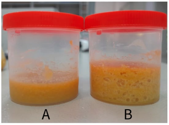 (A) The protein bran mixture with the inoculum before incubation for the fermentation process; (B) fermented feed after incubation, with gas production indicating fermentation occurrence.