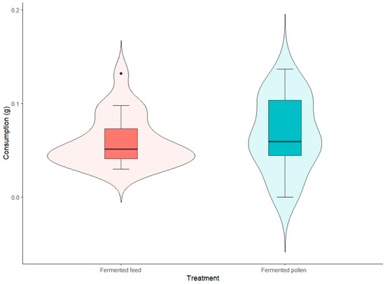 The normality curve indicated that the consumption data followed a normal distribution (Shapiro–Wilk test, p = 0.21). There was no statistically significant difference between the fermented feed (0.060 g) and fermented pollen (0.067 g) consumption groups (paired t-test, p = 0.53), suggesting the similar consumption of the fermented feed compared to fermented pollen. While the medians between treatments were comparable, the interquartile range of the group receiving fermented pollen was larger than that of the group receiving fermented feed (Figure 3). In both treatments, the third quartile (Q3) was higher.
