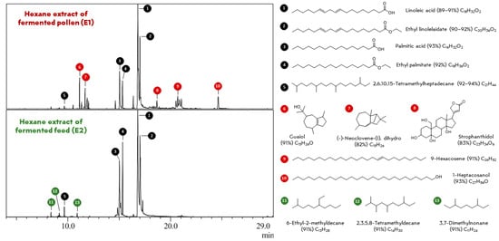 The GC-MS chromatograms of the chemical extracts of fermented pollen and feed samples obtained by liquid–liquid extraction with hexane (E1 and E2). The red, green, and black colors represent the compounds annotated in fermented pollen samples, fermented feed, or both, respectively. On the side, the chemical structures suggested by the NIST08.LIB library are provided, with their similarity percentage in parentheses, based on the fragmentation profiles.
