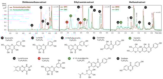 UHPLC-DAD chromatograms from extracts of fermented pollen and feed samples obtained by liquid–liquid extraction with dichloromethane (E4 and E5), ethyl acetate (E7 and E8), and methanol (E10 and E11). The red, green, and black colors represent the compounds annotated in fermented pollen samples, fermented feed, or both, respectively. Chromatograms from E13 and E14 are not depicted here because their similarity with E10 and E11, respectively.. Annotations of chemical structures based on matches in the GNPS library are shown below.