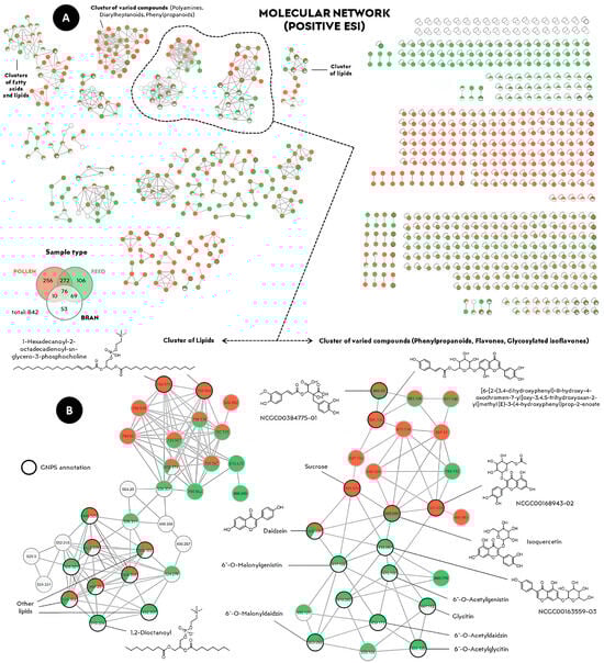 (A) The molecular network of positive ionization of organic extracts from pollen samples (in red), fermented feed (in green), and bran mixture with sucrose syrup (in white) generated by the default parameters of the GNPS platform. (B) Magnified family clusters highlighted in (A). The presence of a given color indicates the feature detection in the corresponding extract (sample type).