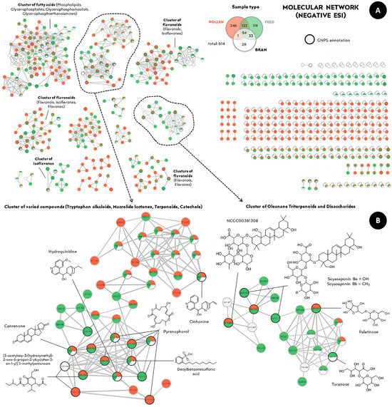 (A) The molecular network of negative ionization of organic extracts from pollen samples (in red), fermented feed (in green), and bran mixture with sucrose syrup (in white) generated by the default parameters of the GNPS platform. (B) Magnified family clusters highlighted in (A). The presence of a given color indicates the feature detection in the corresponding extract.
