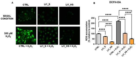 Different antioxidant effects of Lt1_S and Lt1_HS on HaCaT cells. (A) The upper panels show the basal conditions. The lower panels show the induced oxidative stress condition. (B) The histogram summarizes the data in the two experimental conditions. One-way ANOVA was performed using Prism GraphPad 10.2 software; p-value: p **** < 0.0001.