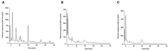 Extracts were analyzed by a High-Performance Liquid Chromatography (HPLC—Dionex UltiMate 3000 series, Thermo Fisher Scientific—San Jose, CA, USA) instrument equipped with a diode array detector (DAD) and connected in series to an Ion Trap mass spectrometer (MS, LinearIon Trap LTQ XL, Thermo Fisher Scientific—San Jose, CA, USA). Compounds were separated in a Spherisorb S3 ODS-2 C18 column (3 μm, 4.6 × 150 mm, Waters—Milford, MA, USA) kept at 35 °C, under a gradient of 0.1% (v/v) formic acid in ultrapure water (A) and acetonitrile (B). UV-Vis spectra were acquired between 180 and 700 nm, and the chromatograms were processed at 280, 330, and 370 nm for the different classes of phenolic compounds. The HPLC eluate was analyzed by high-resolution, tandem mass spectrometry, and the compounds were ionized using an electrospray ion source (ESI) source operating in negative mode. Full MS and MS/MS spectra were acquired in the range from 110 to 1800 charge-to-mass ratio (m/z). The full MS scan and MS n scans were acquired by applying a collision energy of 35 (arbitrary units). When needed, a dynamic exclusion strategy was employed. Data acquisition and processing were conducted with the Xcalibur® software 4.3 (Thermo Fisher Scientific, San Jose, CA, USA). For compound identification, the elution order on the C 18 column and characteristics of the UV-Vis and mass spectra (molecular ion ([M-H]−), and MS/MS fragments) were interpreted and compared with standards when available, the literature data, and the libraries available. Quantification was performed using 9-point external calibration curves of authentic standards. The results of phenolic compounds were expressed as mg per g of freeze-dried extract (mg·g−1, dry weight, dw).