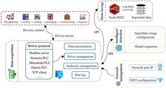 Meat processing is a complex multi-stage process incorporating key stages such as slaughtering, cooling, cutting, packaging, warehousing, and logistics [1]. Traditional meat processing relies largely on manual operations, which often results in high labor intensity, time consuming, and relatively low efficiency processes [2]. In the context of the fourth industrial revolution (Industry 4.0), automation technologies have been widely used in livestock processing. The introduction of innovative technologies such as mechanical cutting, intelligent detection, and automatic boning can substantially improve product quality, yield, and processing efficiency, providing new possibilities for the sustainable development of the industry [3,4,5]. As automation increases, the equipment in the meat processing chain presents diversified characteristics, employing a variety of hardware interfaces and communication protocols, such as Modbus, RS485, RS232, OPC, TCP, various types of PLC, and ZigBee. This heterogeneity considerably increases the complexity of meat processing data acquisition and device integration, and becomes a major obstacle to achieving full interconnectivity [6,7,8,9].