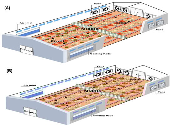 Litter samples were randomly collected from six designated locations (Figure 2) within each barn at 19 and 27 days of age, with moisture content analyzed according to AOAC method 934.01 [23]. Briefly, the moisture content in the litter was analyzed by collecting 100 g of litter from each location on the day of measurement. The moisture content was measured by drying in dry oven at 105 °C for 24 h, and the moisture content was expressed as a percentage (%) of the difference in weight after drying from the weight before drying.