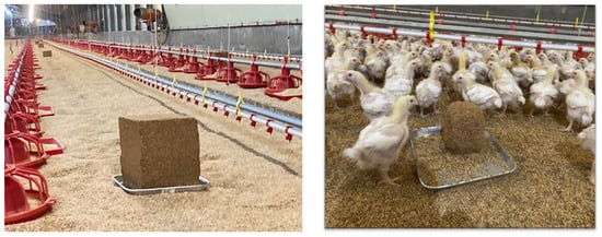 In this study, to provide environmental enrichment for broilers, grain-based pecking blocks have been developed by Sinaebio Co., Ltd. (Sungnam-si, Republic of Korea). These blocks were designed as cubic structures with dimensions of 25 × 25 × 25 cm (Figure 2) and consisted mainly of 50~60% by-products such as wheat bran, 10~20% grains and 10~15% limestone, supplemented with additional components such as moisture and glycerin. The grain blocks were changed regularly every 14 days for a total of 27 days of experiment.