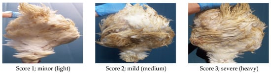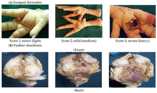 Footpad dermatitis, hock burn, and feather cleanliness were assessed following the Welfare Quality Assessment protocol for poultry [25]. On days 19 and 27, a total of 180 birds were randomly selected from each house (15 birds per location × 6 locations × 2 houses) and inspected. Both footpad dermatitis and hock burn were scored on a 3-point scale (from 1 to 3), where a score of 1 indicated no signs of the condition, 2 indicated mild symptoms, and 3 indicated visible symptoms. Feather cleanliness was also rated using a 3-point scale (from 1 to 3), with 1 representing clean feathers, 2 representing slightly dirty feathers, and 3 representing significantly dirty feathers. Figure 3 shows examples of the score criteria used in our study to measure foot pad dermatitis and feather cleanliness.