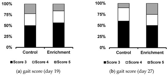 In our study, gait scores also did not show significant differences between groups. The gait score of broilers is an indicator of leg impairment and leg lameness and is used to assess leg health and welfare levels [37]. The effects of environmental enrichment on broiler gait scores vary, and the provision and combination of appropriate enrichment is important to stimulate natural behaviors and enhance walking ability of broilers [32,37]. In a study by Dejong and Gunnink [32], the combination of straw bales and natural light promoted activity and improved walking scores compared to unenriched controls or straw bales alone. Additionally, natural light was more effective when provided with straw than when combined with wood chips [32]. Providing oat hulls was suitable for stimulating active behaviors such as foraging and dust bathing and improving leg health, with higher gait scores observed at the end of the experiment [5]. However, the lack of significant difference in the gait scores of broilers despite providing environmental enrichment may have been due to the small sample size [32], so further studies should include a larger sample size.