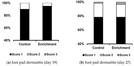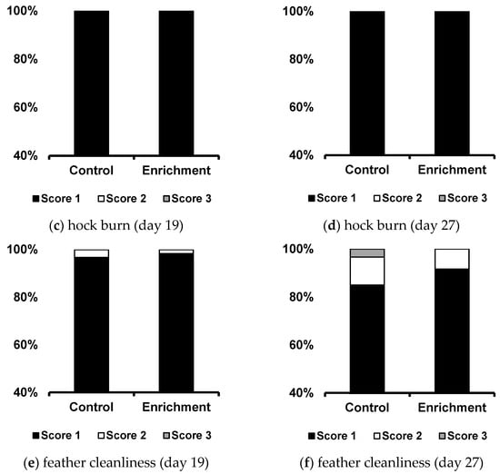 Distribution of broiler assessment results according to the level of footpad dermatitis, hock burn, and feather cleanliness between the control and enrichment (grain-based pecking block) groups at 19 days and 29 days of age on animal welfare-certified farm. Footpad dermatitis (19 days; χ2 = 0.299, 27 days; χ2 = 0.559) and feather cleanliness (19 days; χ2 = 0.828, 27 days; χ2 = 0.281) were measured in an average of 90 birds/house in the control and enrichment, according to the RSPCA. Higher scores indicate negative outcomes for welfare and health. Fisher’s exact test was used instead of the χ2 -test if at least one expected frequency was less than 5 between the treatments. No significant differences were found in the assessments. Control, environmental enrichment (grain-based pecking blocks) not provided; enrichment, environmental enrichment (grain-based pecking blocks) provided (one grain block per 1000 birds).